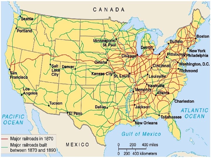 Growth caused by railroads • Railroads gave land their value; towns where railroads ran became sprawling cities while those skipped by railroads sank into ghost towns, so, obviously, towns wanted railroads in them. Cornelius Vanderbilt -owner of the New York Central Railroad financed western railroads • 1883 time zones developed by ARA