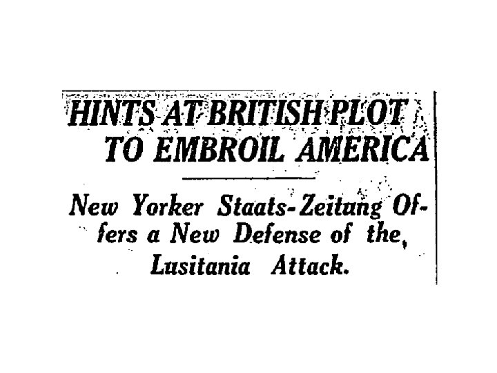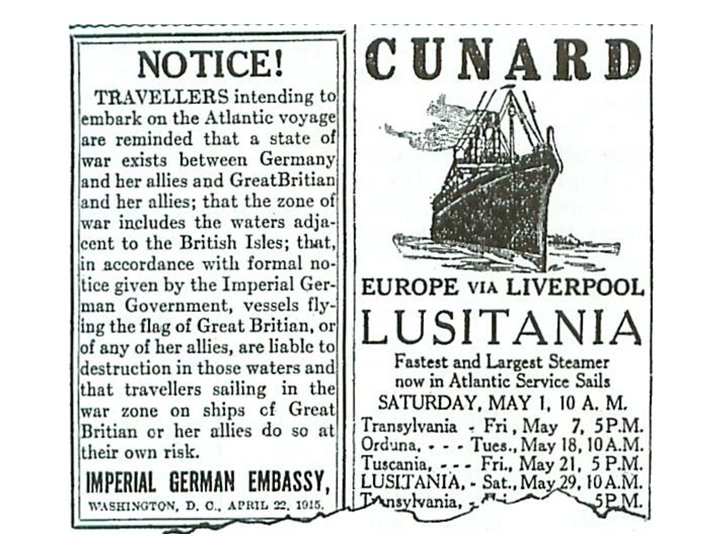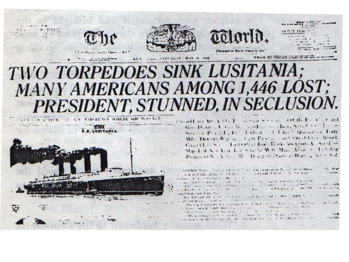 Ships Lusitania – British passenger ship traveling (5/15) in the Irish Sea…with weapons from USA to England. Sunk. 1200 killed. Yellow Journalism/Jingoism – “Frightfulness” and “Barbarism” used by the press. Accounts of children dying at sea. President Woodrow Wilson demands that Germany warn ships before sinking. Germany abides, provided the crew does not resist.