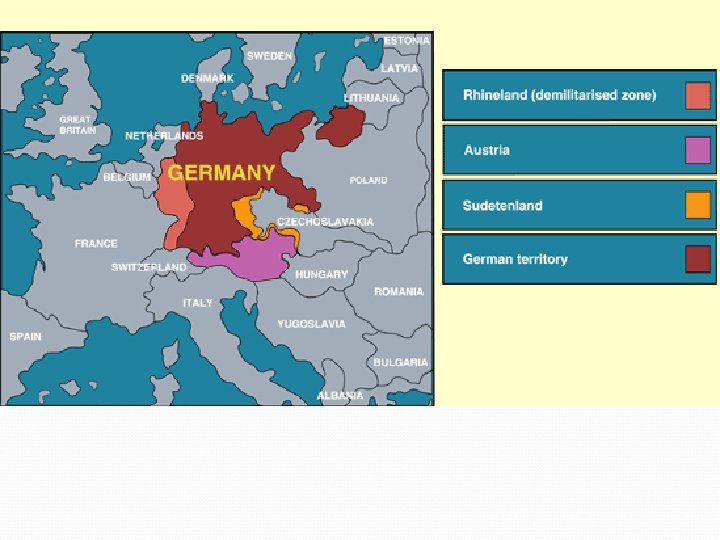 Hitler’s violation of the Treaty of Versailles � 1935 - mandatory military service in Germany. I � 1936 - took over the demilitarized German Rhineland. �In March 1938, Hitler invaded Austria. �(Note: Austria actually voted for the occupation, fully aware that if it resisted, Germany would forcefully take over Austria. ) �At a conference in Munich, Germany in September 1938, the Western European democracies, unprepared for war, gave away Sudetenland to Germany. �In March 1939, Hitler took control of Czechoslovakia.