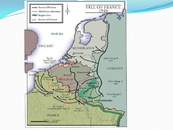 Fall of France �May 10 th , 1940 �The battle consisted of two main operations. �Fall Gelb (Case Yellow), German armored units pushed through the Ardennes to cut off and surround the Allied units that had advanced into Belgium. �Fall Rot Case Red), executed from June 5 th, German forces attacked the larger territory of France across the Maginot line. �Italy declared war on France on June 10 th. �The French government fled to Bordeaux and Paris was occupied on June 14 th. �France surrendered on June 25 th.