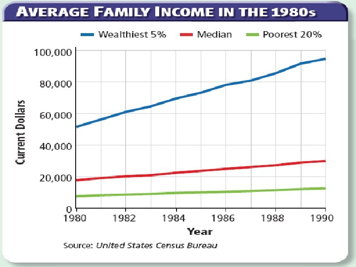 The Battle of the Budget • Supply-side economics (Reaganomics) – Tax cuts for the wealthy – In theory, the rich would use this money to invest and spend money to improve the economy – Very similar to Andrew Mellon’s tax policy from the 1920 s • Increase in military spending – $2 trillion for the Pentagon in the 1980 s – Helps contribute to federal deficits