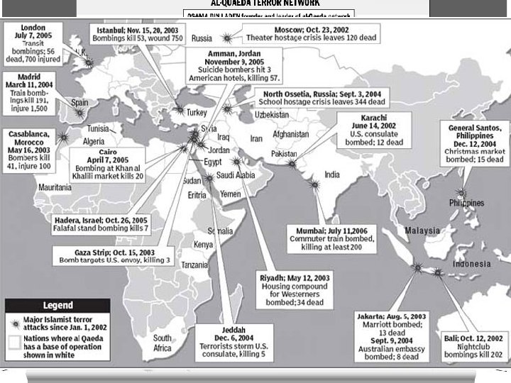 Terrorism Comes to America • September 11, 2001: – NYC, DC, and PA attacks – Over 3, 000 individuals died • Al Qaeda – Osama bin Laden, Islamic fundamentalist – Resented Western presence in the Middle East • PATRIOT Act: – Passed in response to attacks – Increased powers for the federal government • More phone and email surveillance. • Goodbye privacy! • Hello darkness my old friend… • Guantanamo Bay, Cuba – Suspected terrorists have been held