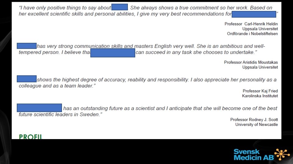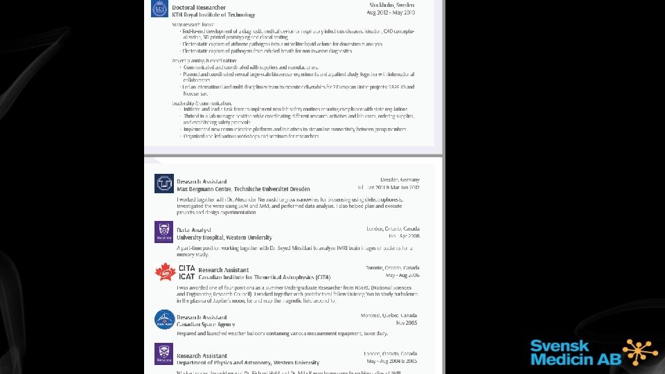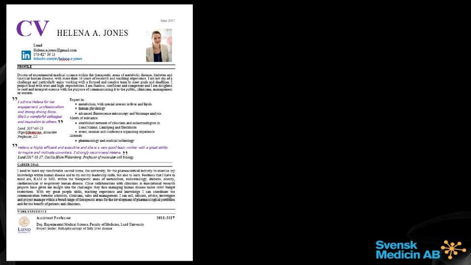 Career development opportunities outside the academia - And how to get there. The demand for recruiting Academics in the Life. Science industry is increasing. This lecture will firstly give an insight into the diversity of positions suitable for Academics and specify the requirements (if any), planning for a career. Secondly - is how to get there. We will focus on how to best visualize your competences and attract recruiter’s attention through optimizing your CV and Linkedin. Niclas Lindqvist Molecular Biologist, >20 years as Brand Leader, Advisor, Global Product Manager, Business Unit Director within recruitment and staffing in Life. Science sector. Certified coach and Senior career advisor. Lecturer for Pharmaceutical industry (GCP, GMP, GDP, Medical Marketing, Regulatory Affairs, Health Economy, Ethical Marketing, Critical reviewing) Trygghetsstiftelsen, Trygghetsrådet, Omställningsfonden, Apotekarsociteten, Mentlife, Certified in OPQ. Owner of Svensk Medicin AB