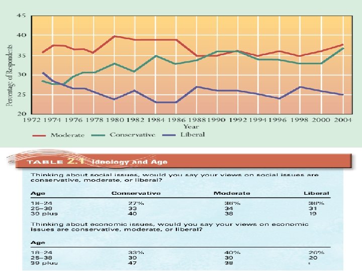IV. Political ideology – a consistent and integrated system of ideas, values, and beliefs about how pervasive a government should be in a society. A. Ideology trends with 3 categories-one dimensional 1. General Pop - Figure (next slide) : Moderates and Conservatives=37%; Liberals=25% 2. By age – Table next slide (18 -24 most liberal) B. Four American ideological camps (two-dimensional): • • Conservatism (_____%) – belief in the value of free markets, limited government, and individual selfreliance in economic affairs, combined with a belief in the value of _____, law and morality in social affairs. Liberalism (16%) – belief in the value of strong government to provide economic security and protection for civil rights, combined with a belief in personal freedom from government intervention in social conduct.