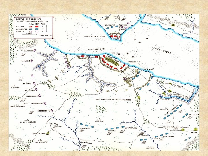 End of War • Cornwallis was surrounded by American and French armies & French navy at Battle of Yorktown, Virginia. • Under a combined siege by the French and Continental • British people, after armies under Washington, the loss at Yorktown, British (Cornwallis) demanded an end to surrendered on October 20, the war (not worth 1781 – last major battle of the $ cost and loss of war life)