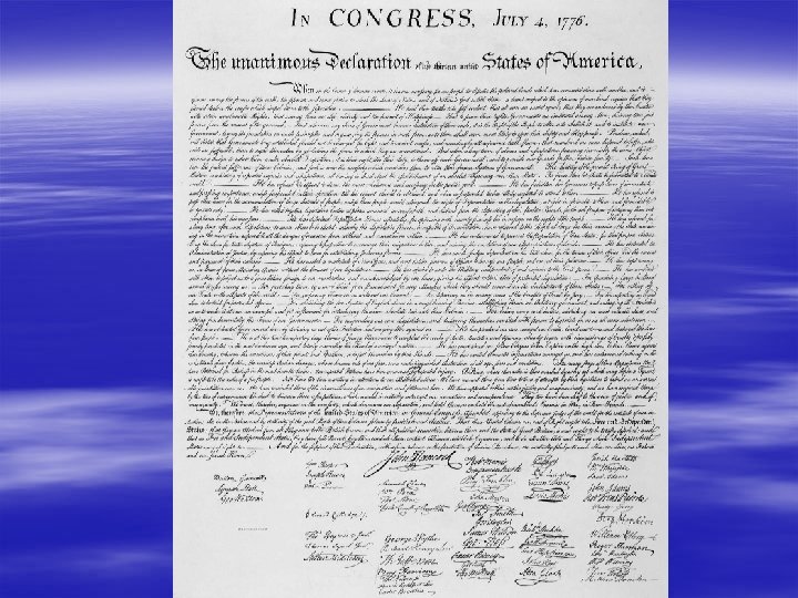 Declaration of Independence § Meant for privileged white men § Was not for women, African Americans, or Native Americans § 1 st draft – was against the slave trade but that was left out of the final draft