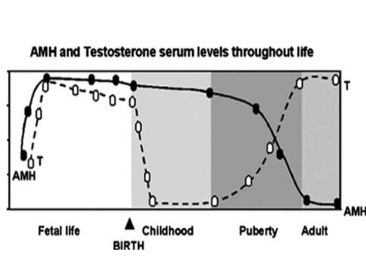Anti –Müllerian-Hormon(AMH) • Anti-Mülleryen hormonu transforming growth faktör-beta süper ailesinin bir üyesidir. • Doku büyümesinde ve farklılaşmasında görev alır. • AMH reseptörünün kodlayan gen 12. kromozomun uzun kolunda bulunur • AMH cinsiyet farklılaşmasında çok önemli bir rol alır(7. gebelik haftasında)