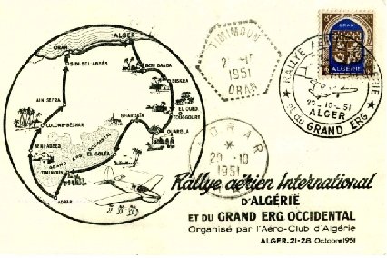 Rallye Aérien International d’Algérie et du Grand Erg Oriental Le 22 octobre 1951 a lieu de le départ du Tour d’Algérie et du Grand Erg Oriental, également appelé TAGEO. Trente-six équipages, soit quatre-vingts personnes, y prennent part venant de Suisse, Belgique, Hollande, Italie et Etats-Unis. Les concurrents, divisés en trois groupes, sont accompagnés par un Junkers 52 transportant des personnalités, dont Mme Jaffreux-Tissot, secrétaire-générale de l’Aéro-club de France. Ce rallye est une des plus importantes manifestations organisées par l’Aéro-club d’Algérie (en accord avec les aéro-clubs de l’intérieur). Il est remporté par le Suisse Golaz en Beechcraft Bonanza. Les différentes épreuves ont permis de tirer des enseignements susceptibles de définir l’avion idéal pour répondre aux besoins de l’aviation africaine.