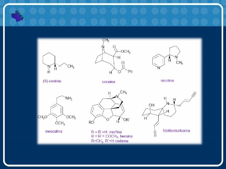 Alcaloides • Los alcaloides son un grupo importante de aminas biológicamente activas, que son biosintetizadas por algunas plantas para protegerse de insectos y otros animales depredadores. A continuación, se indican las estructuras de algunos alcaloides representativos.
