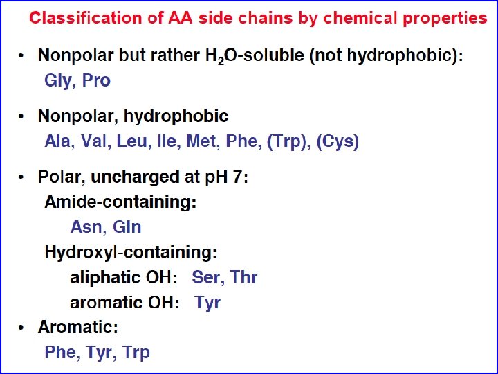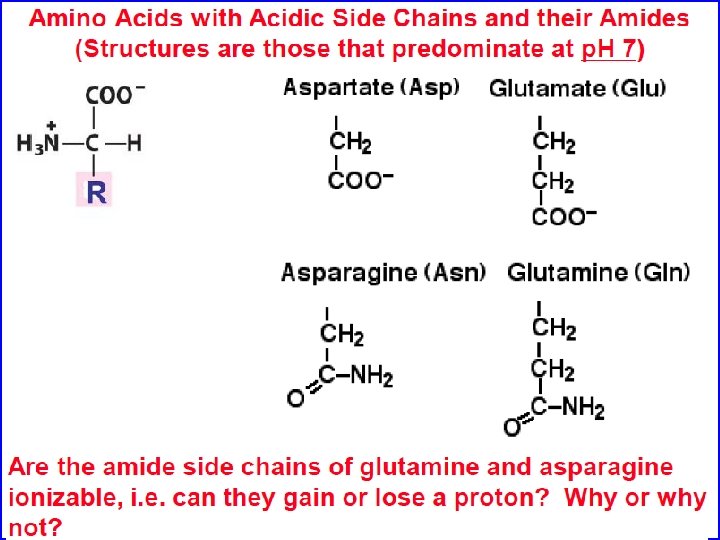 Amino acids are the building blocks of proteins • Three major parts: carboxyl group, amino group, and side chain. • Central C atom called alpha carbon. • Amino acids can differ in their side chains (R). • The alpha carbon is a chiral center. (except for one amino acid) • L-form found almost exculsively in proteins (CORN)