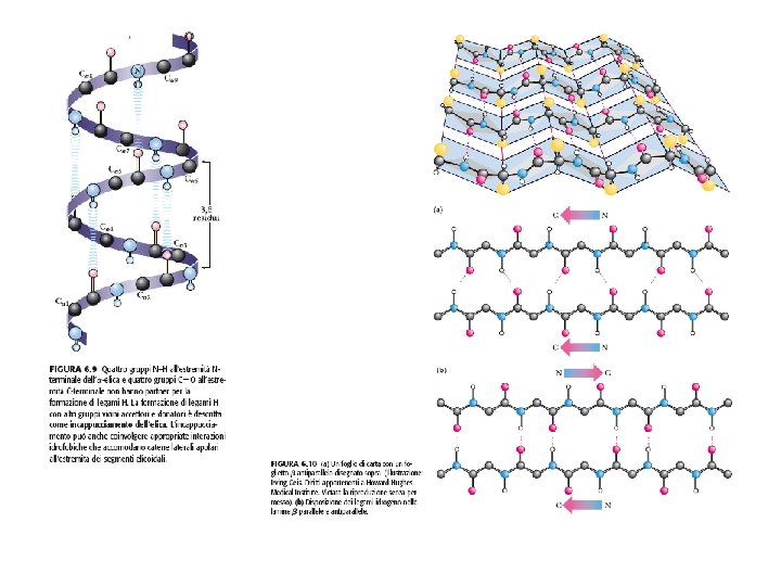 Dipendono dall’instaurarsi di legami idrogeno α-elica Prevale notevolmente in natura l’elica destrorsa ed è la più diffusa essendo contenuta da tutte le proteine globulari e da alcune fibrose foglietti β Consiste in un’elica allungata, o a passo più lungo. Sono tenute insieme da legami idrogeni intercatena fra gruppi carbonilici di una catena e gruppi amidici della catena parallela