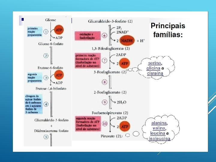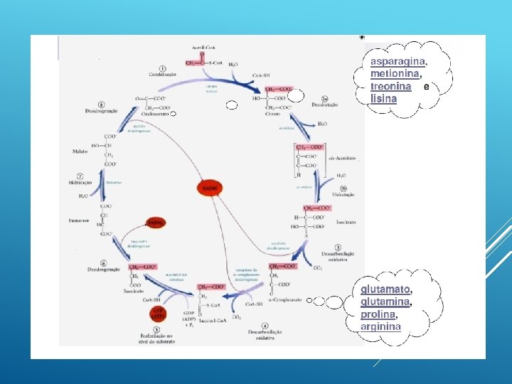QUANTO AO DESTINO Destino glicogênico Quando o álcool restante da quebra dos aminoácidos vai para a via glicolítica. Os aminoácidos que são degradados a piruvato, acetoglutarato, succinil-coa, fumarato ou oxaloacetato. A partir desses aminoácidos é possível fazer a síntese de glicose, porque esses intermediários e o piruvato podem ser convertidos em fosfoenolpiruvato e depois em glicose ou glicogênio.