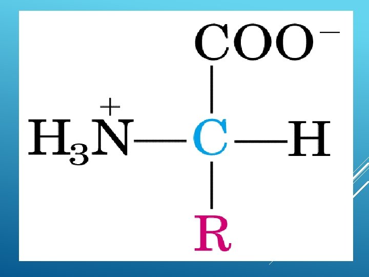 AMINOÁCIDO FÓRMULA GERAL: R - CH (NH 3+) – COO- R = radical orgânico (glicina = H). C ligado ao radical R é o 2 ou alfa. Forma ionizada Grupo amino (-NH 2). Grupo carboxila (-COOH). Cadeia lateral