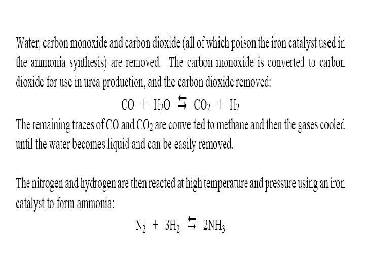Raw material : Hydrogen from synthesis gas, Nitrogen from air addition or from liquefication process Quantitative requirements: Basis: 1 ton ammonia 85% yield Hydrogen 0. 21 ton or 2000 Nm 3 Nitrogen 0. 96 ton Synthesis catalyst 0. 2 kg power 850 KWH Fuel gas or compressors 3, 800 Kcal Cooling water 12. 5 tons Plant capacity: 100 -1, 500 tons/day of ammonia