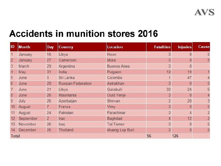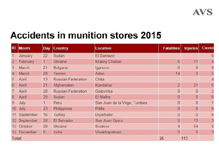 Recorded causes • Lack of surveillance leading to ammunition deterioration. • Inappropriate storage infrastructure and systems. • Handling errors and inappropriate working practices. • Failure to take into account external, environmental influences and events. • Poor security. • Cause not known.