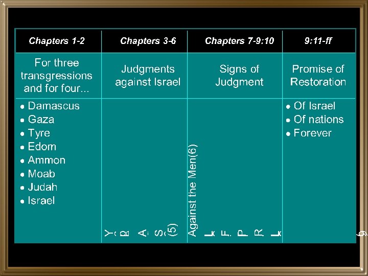 Five Signs of Judgment • Vision of Locusts • Vision of Fire • Vision of Plumbline • Vision of Ripe Fruit • Vision of the Lord by the Altar