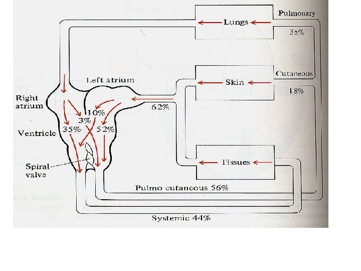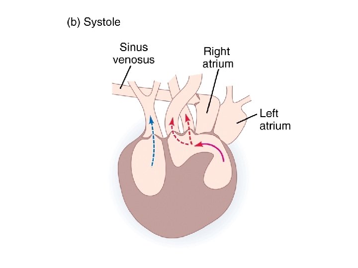 • Left atrium receive oxygenated blood • Right atrium receive deoxygenated • Right atrium contract before left (slightly) and its blood ejected to cavum pulmonar over the free edge of horizontal septum. • Left atrium eject to cavum arteriosum • Cavum venosum mix