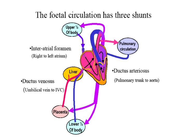 Fetal Circulation (cont. ) • In right ventricle, oxy. blood sent to pulmonary artery – Lungs nonfunctional – Ductus arteriosus diverts blood from lungs