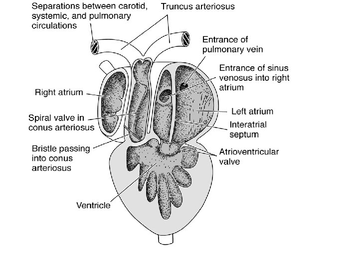 Lungfish and Amphibian vs Dogfish • Modifications of partial or complete partition in atrium – Left and right atria • Advent of lungs – Double circulation – Modification in conus arteriosus – Semi-lunar valve modified to shunt deoxygenated blood to lungs (spiral valve)