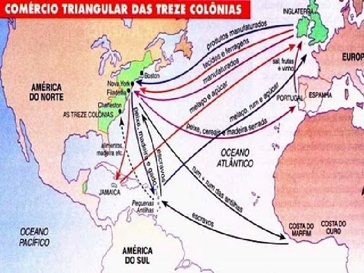 Colônias do Norte • • Colônia de Povoamento Clima Temperado Predomínio de pequenas e médias propriedade Agricultura familiar Manufaturas incipientes no inicio do século XVIII Predomínio da mão-de-obra livre Servidão de Contrato: Interessados em vir para a América sem condições de arcar com as despesas da viagem e instalação eram arcados por colonos ricos. O pagamento era realizado com trabalho não remunerado por um tempo determinado.