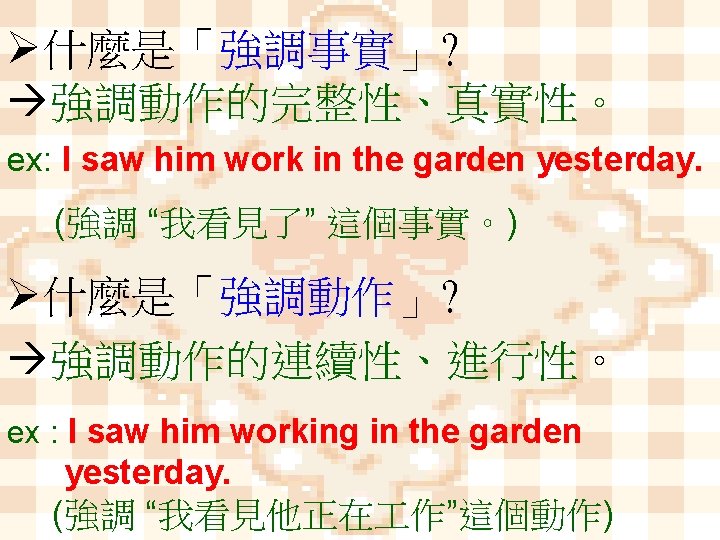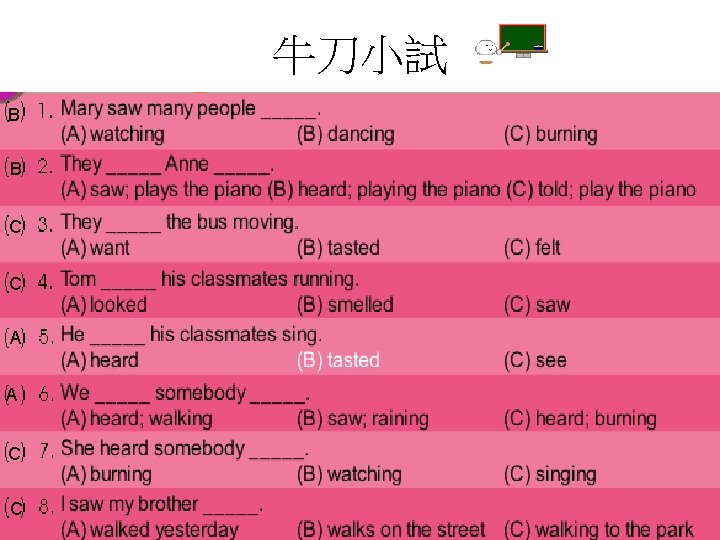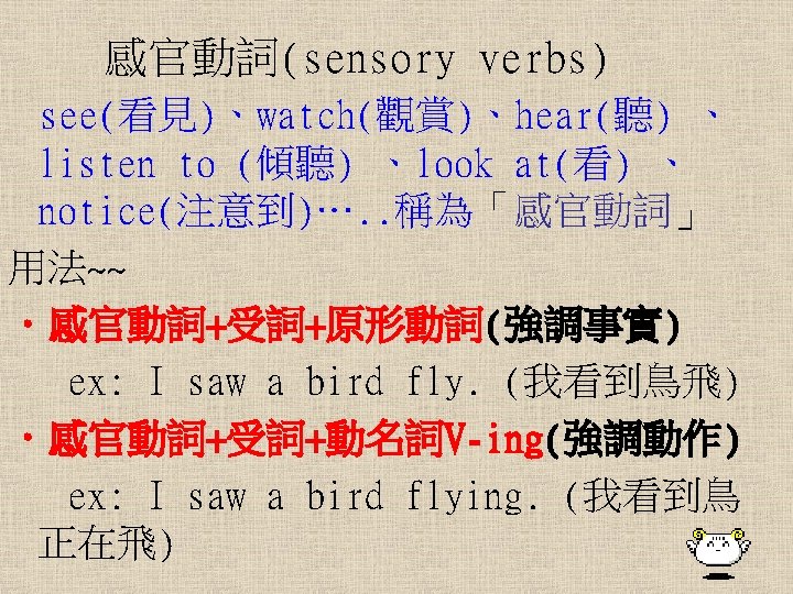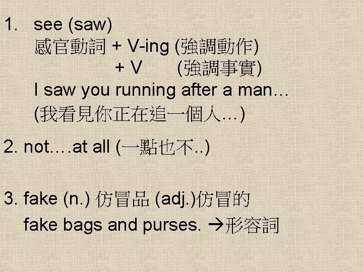 看圖說故事~~ We / see / the boys / play / dodge ball We saw the boys playing (play) dodge ball. I / hear / they / chat / on the bench. I heard them chatting (chat) on the bench I / see / he / do the dishes I saw him doing (do) the dishes.