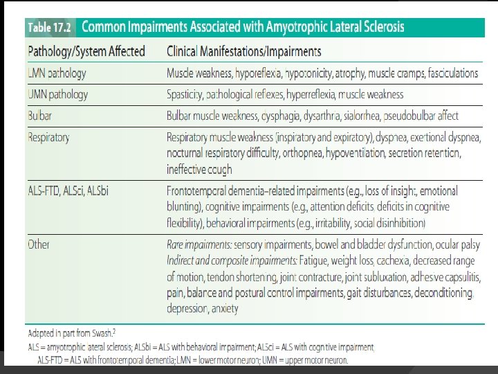 Summary � � � Amyotrophic lateral sclerosis, the most common and devastatingly fatal motor neuron disease among adults, causes a progressive increase in the number and severity of impairments, activity limitations, and participation restrictions. Other than a small percentage of cases, etiology for the most part is unknown, and it is hypothesized that multiple mechanisms may be responsible for the disease. Although there is no cure for ALS and its course cannot be altered, it should be considered a “treatable disease. ” Medical management is primarily symptomatic, and a team approach to care is considered optimal. Rehabilitation management is focused on maximizing function and promoting independence to the highest level possible, and ensuring optimal quality of life throughout the course of the disease and across health care settings.
