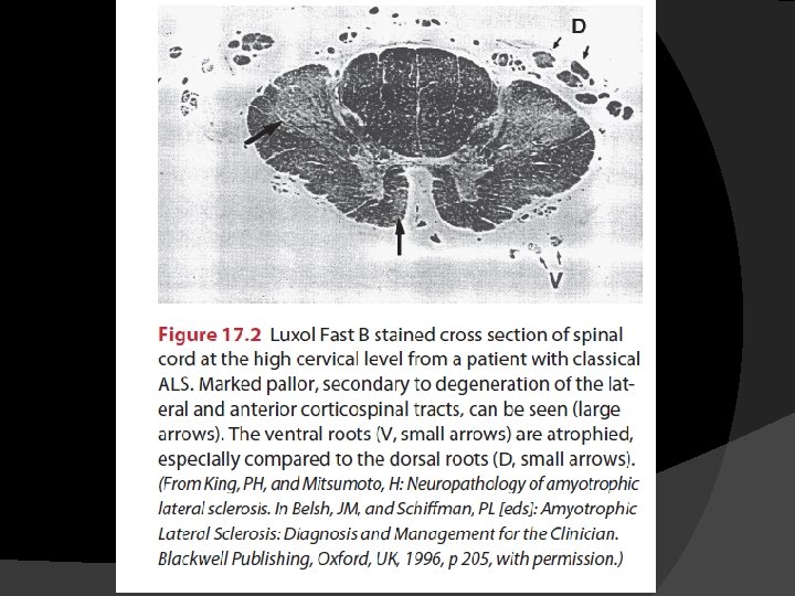 � Motor neurons of the Onufrowicz nucleus (Onuf’s nucleus), located in the ventral margin of the anterior horn in the second sacral spinal level, are also generally spared � These neurons control striated muscles in the pelvic floor, including anal and external urethral sphincters