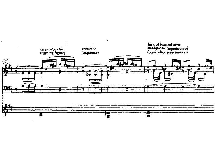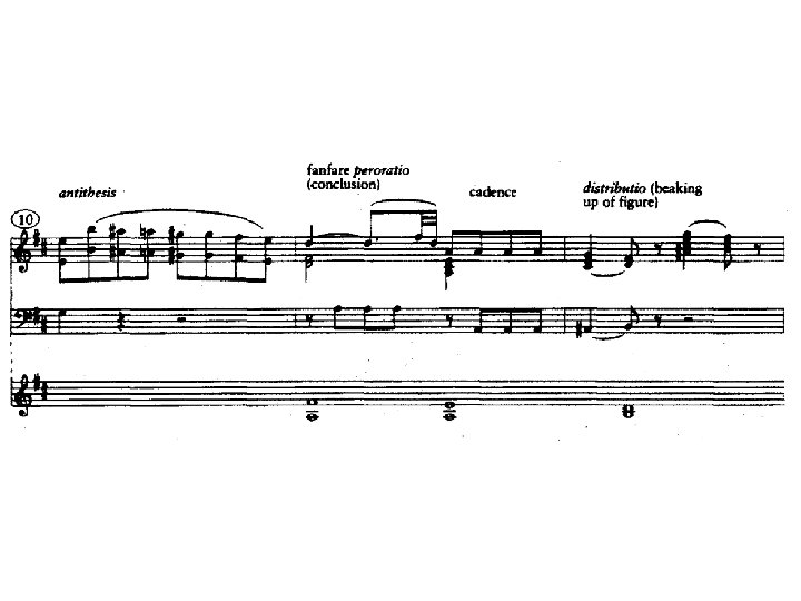 Rhetoric and Music • From about 1600 terms drawn from the rhetoric of Greek and Latin antiquity came to be used in music analysis, though never forming a comprehensive or complete system. Treatises were written to introduce aspiring composers to the potential of using them. • Some relate to formal analysis – introductions, beginnings, middles, endings and codas; some to expressive devices (“hypotyposis”, meaning word painting, for example); some to technical devices (fugal imitation, chromaticism, fauxbourdon effects, etc. ) • Ratner draws on the terminology of the 17 th and 18 th centuries for names for his “topics” – allusive clichés, if you like. For analysis these may be useful though there is no theoretical reason to draw literally on them.