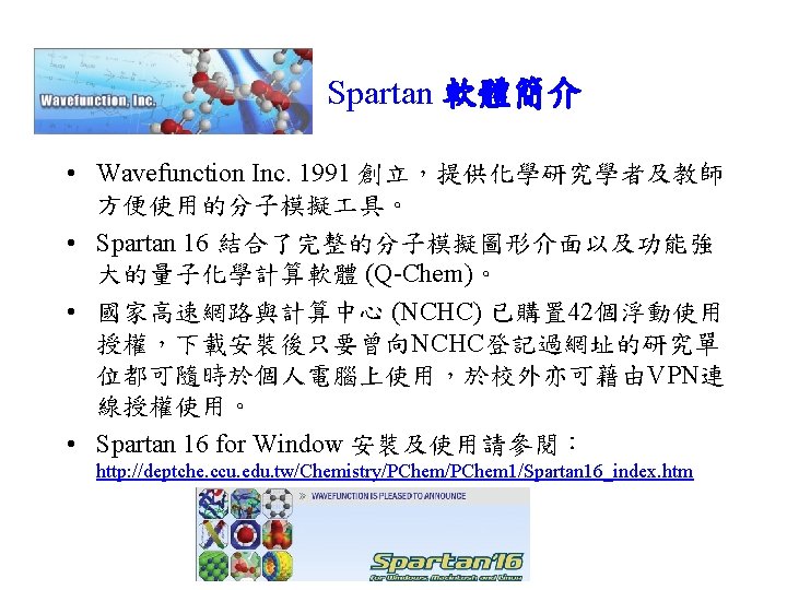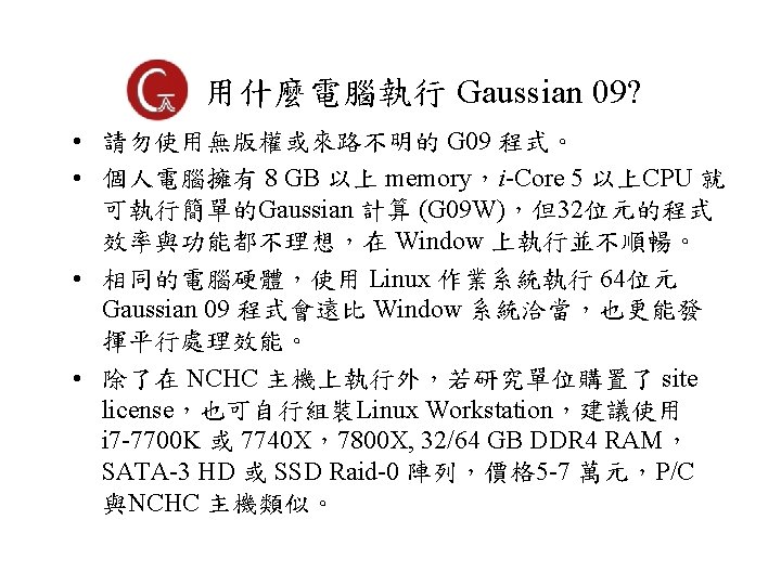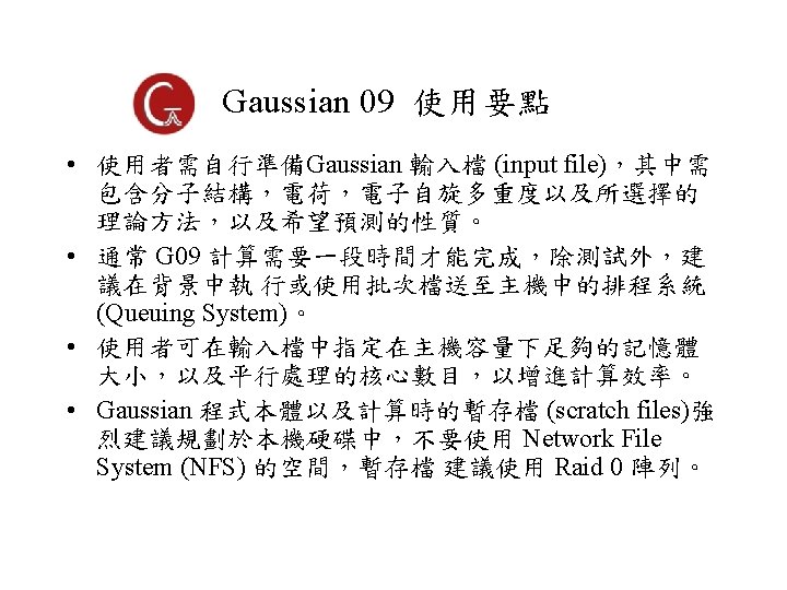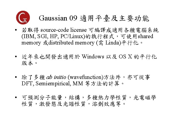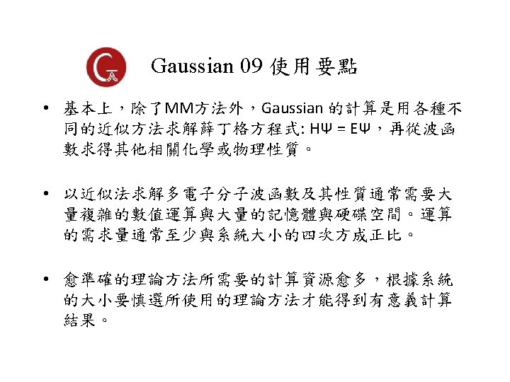 Gaussian 軟體簡介 • 由 John Pople 研究團隊 (Carnegie-Mellon University)自 1970 年以來持續發展的一套多功能量子化學計算軟體. • 使用 Gaussian-type atomic orbitals 取代 Slater-type orbitals,因此命名為 Gaussian • 原本可由 Quantum Chemistry Program Exchange (Gaussian 80, QCPE)取得,1987 年後成立 Gaussian Inc. • John Pople (1925 -2004) 於 1998 與 Walter Kohn 共同獲 得諾貝爾化學獎。 • Gaussian 為目前世界上功能最齊全,使用最廣的量子化 學計算軟體,最新版本為 Gaussian 16, Rev. A 03