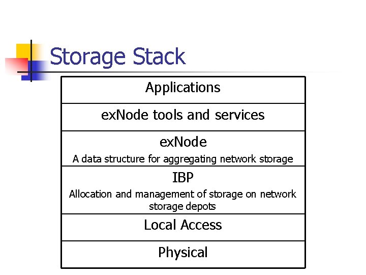 Storage Stack Applications ex. Node tools and services ex. Node A data structure for aggregating network storage IBP Allocation and management of storage on network storage depots Local Access Physical