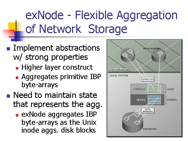 ex. Node - Flexible Aggregation of Network Storage n Implement abstractions w/ strong properties n n n Higher layer construct Aggregates primitive IBP byte-arrays Need to maintain state that represents the agg. n ex. Node aggregates IBP byte-arrays as the Unix inode aggs. disk blocks