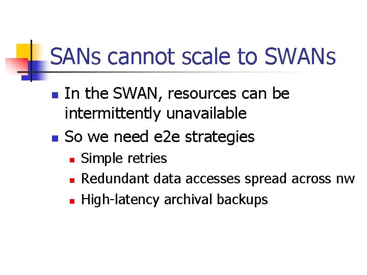 SANs cannot scale to SWANs n n In the SWAN, resources can be intermittently unavailable So we need e 2 e strategies n n n Simple retries Redundant data accesses spread across nw High-latency archival backups