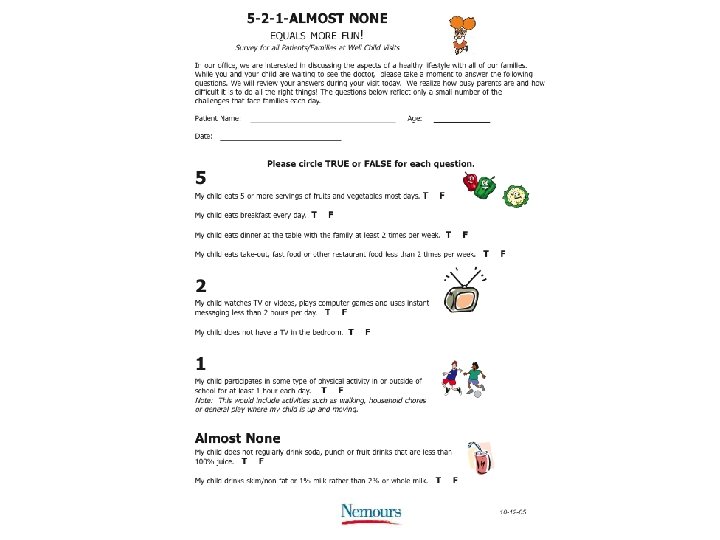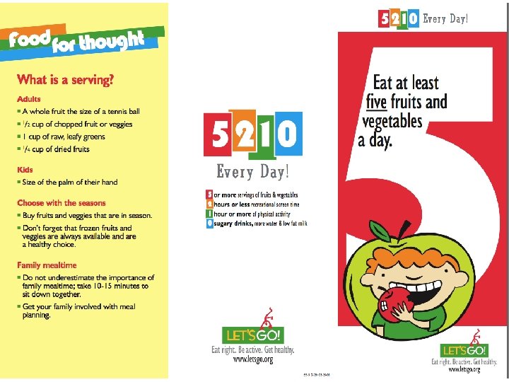 Simplification: 5 -2 -1 -almost none • Consume 5 fruits and vegetables a day = 5 • Limit screen time to 2 hours or less per day = 2 • Engage in 1 hour or more of physical activity per day (moderate to vigorous exercise) = 1 • Consume no sugary beverages each day = 0