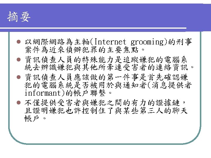 Messenger Plus! l l l Table 2 – Table of registry settings for a contact under Messenger Plus! Name Type Data Notes REG_SZ (value not set) Custom. Name REG_SZ This is the name of my victim Last. Chat REG_DWORD 0 x 43 e 30 d 2 b (1138953515) Last. Sign. In REG_DWORD 0 x 44191825 (1142495269) Last. Unknown. Offline REG_DWORD 0 x 43 df 9117 (1138725143) Special. Color REG_DWORD 0 x 0000 (0) Special. Format REG_DWORD 0 x 00000001 (1) Auto. Attach. Tag REG_DWORD 0 x 0000 (0) l l 對嫌疑犯的Windows登入金鑰放置在 SoftwarePatchouMsg. Plus 2[suspec t-MSNemail-address]Contacts作檢 驗將進一步顯示以 @P_KUly 1 ipe 2_nlbqw. Kpj. DUolugliwew_ o. KUi命名的登錄金鑰。 左表為此金鑰所具備的參考價值。 l Auto. Attach. Tag值設為 0 l Messenger Plus是設為不顯示用 戶的真實名稱。 l 如果沒有格式化,Special. Format 值設為 0 l 若名稱顯示為黑體字, Special. Format值設為 1 l 如果顯示為斜體字, Special. Format值設為 2 l Last. Chat 是顯示與聯絡人上次的 對話開始與結束 l Last. Signin顯示最後一次從用戶 的Messenger帳戶登入 l Last. Unknown. Offline是當 Messenger Plus!被安裝後,由 Messenger Plus!所知聯絡人未上 線的狀態。