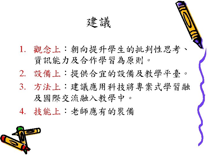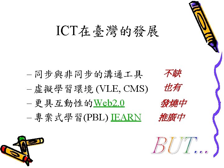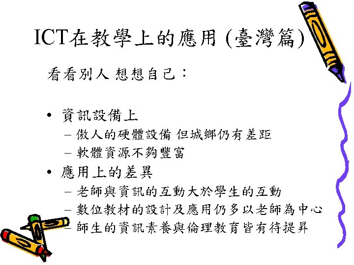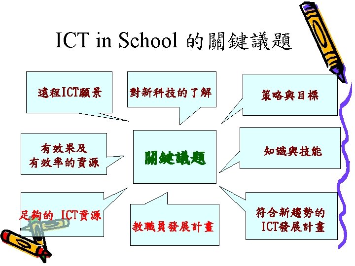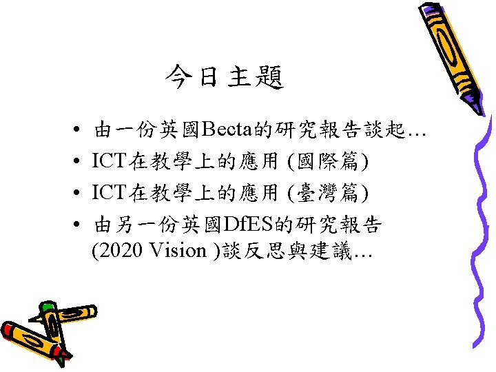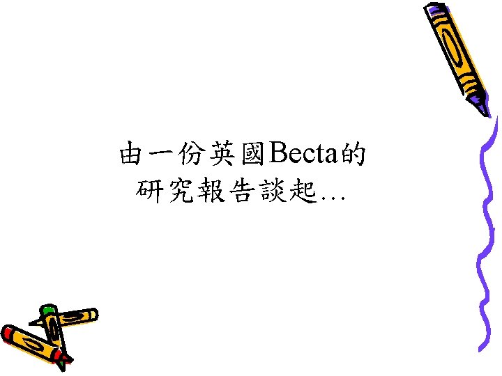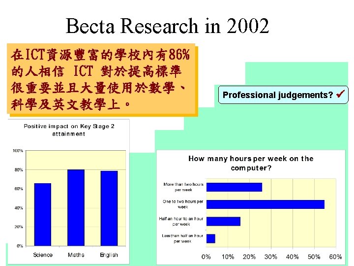 Becta Research in 2002 Research? 有大量的研究顯示善用 ICT對教學有幫助。 Professional judgements? ü Schools of future? Link to other ICT variables? Link to how well used? Link to subject usage? ü Benchmark? Continue over two years? Good ICT - Standards? ü ü ü ü