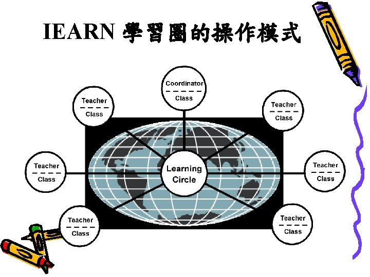 IEARN 學習圈 • Learning Circles promote theme-based project work integrated with the classroom curriculum • Working with Learning Circle partners from around the world helps students develop important interpersonal skills • Learning Circles also encourage interactions among teachers providing a very different model of professional development Learning Circles