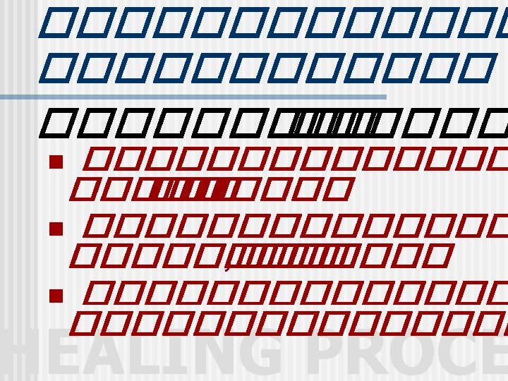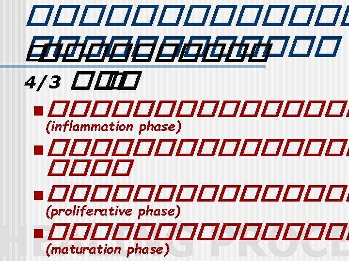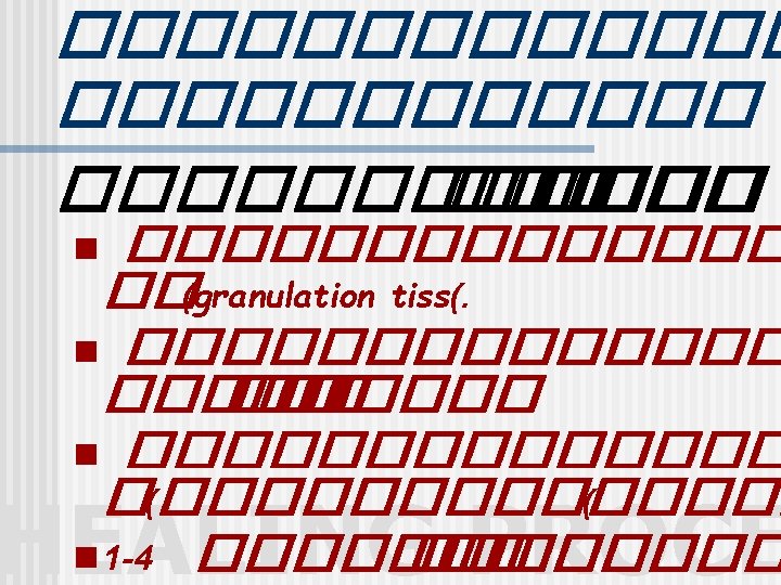 This is a wound in the second stage of healing (proliferative stage). Note the red granulation tissue overlying the muscle. Note also that the edges appear to be squeezing in on the tissue (early contraction). This is a fasciotomy wound in the leg HEALING PROCE • http: //woundhealer. com/Pic. Guid. Hlg. htm