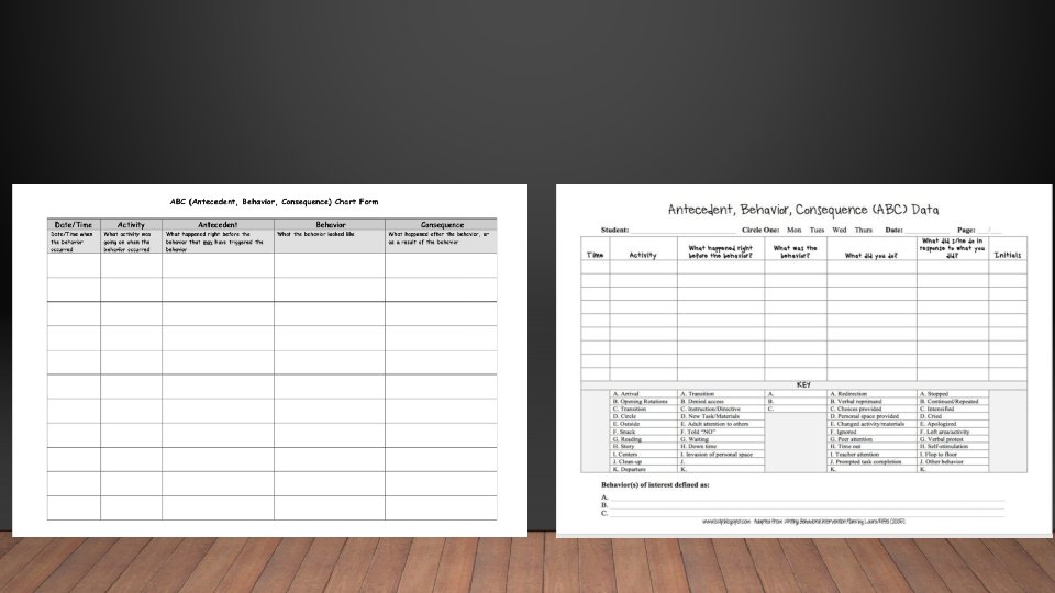 • Use the ABC’s • Antecedent-What happens directly before a behavior occurs. • Behavior-Exactly what the behavior looks like. Use specific language o Good Example: Student hit staff twice, kicked a desk and screamed for 10 minutes. o Poor Example: Student was disruptive/aggressive. • Consequence-What happens directly after a behavior. o This does NOT mean punishment.
