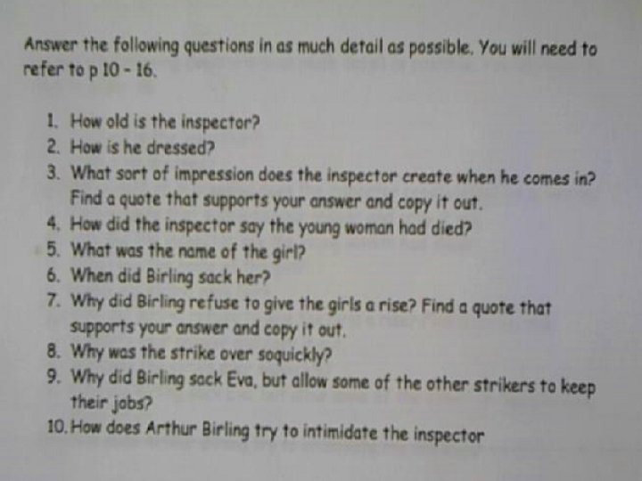 • In your own words, explain Birling’s link to Eva Smith. (D) • Using a variety of quotes, describe Birling’s response to both the arrival and interrogation of the Inspector. (C) Is there any language that implies any emotion? (B) How is the tone relationship between the two characters set at this early phase of the play? (A)