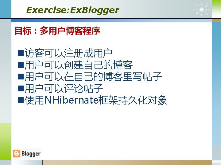 Exercise: Ex. Blogger �建并存�用� var user = Blog. Registrar. Get. Instance(). Create. User(“Mike", "pwd"); var id = _users. Repository. Save(user); �取所有用� var users = _users. Repository. Get. All();