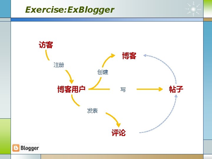 Exercise: Ex. Blogger Visitor Blog Register Create User Create Ubiquitous Language 领域通用语言 Comment Post