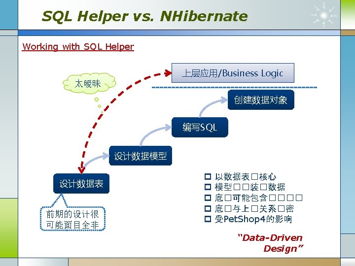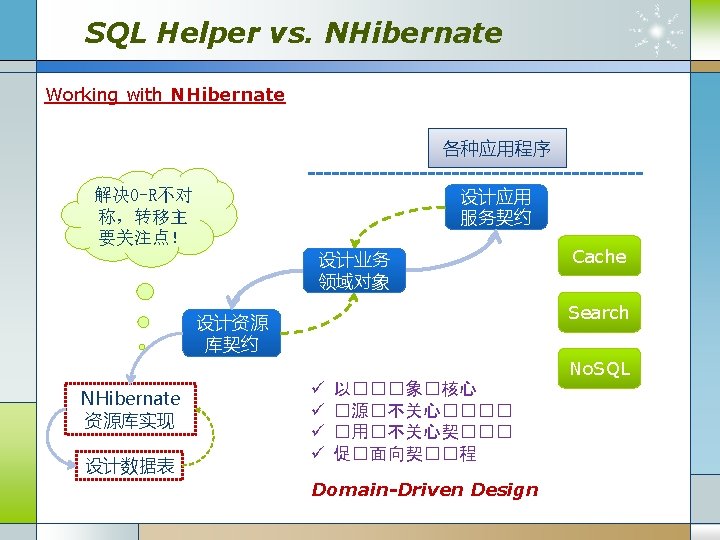Hibernate: a Java ORM Framework 对象 Hibernate 关系 活动的熊 Hibernate 冬眠的熊 关注点 Java : e t a n r Hibe NET. : e t a n NHiber 计 设 的 象 对 注 关 更 者 让开发 !