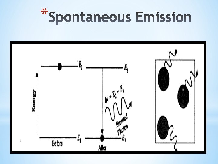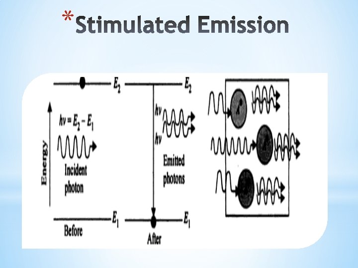 * * If the gain of the medium is capable of storing energy in the form of excited electrons long time before decaying back to the ground state, and increase in proportion of electrons will assume a high energy state as the medium is pumped , until a population inversion occurs. means more atoms in the upper state than the ground state Stimulated emission is the essence of Laser action