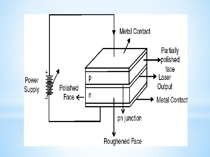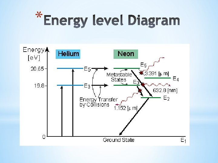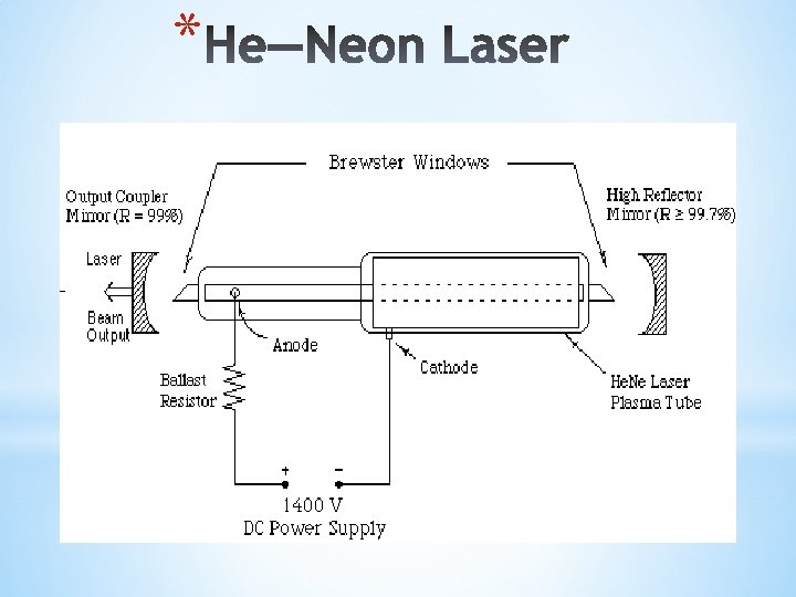 *Pump Source §Provides energy to the laser system – a source of energy to excite electrons in the gain medium to high energy states. Examples : electrical discharges , flash lamps , arc lamps and chemical reactions. • The type of pump source used depends on the gain medium. A helium –neon (He –Ne) laser uses an electrical discharge in the helium –neon gas mixture.