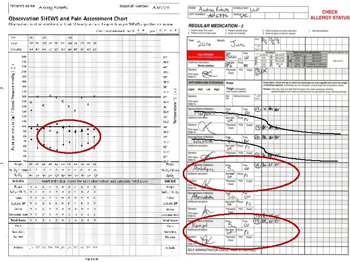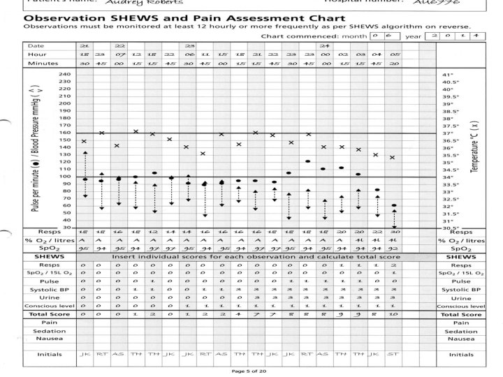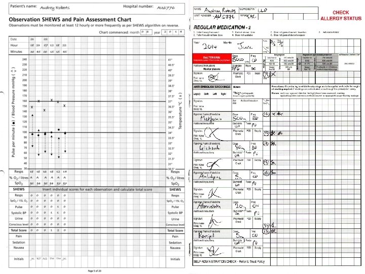 Questions What is wrong with the SHEWs and Drug charts? Continuous low B/P during the day Shews score of 3 at 18: 15 but documented as a score of 1 No recognition of deterioration Therefore no increase of SHEWs monitoring as per ‘SHEWs algorithm for action’ and ‘deteriorating patient sticker’ • Urine output scored as 0 • Remains on all of her medications • •