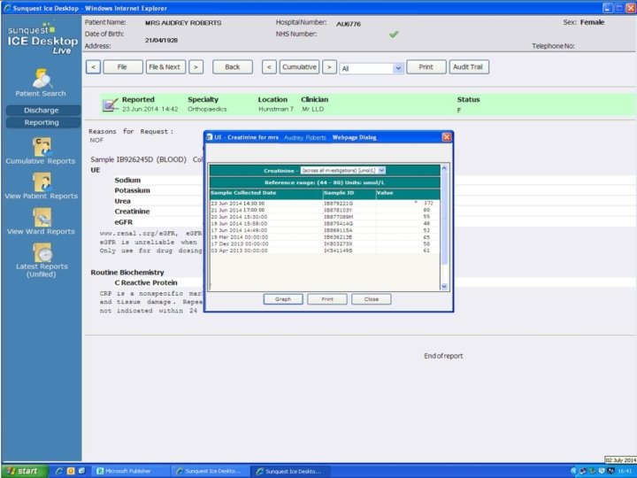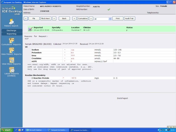 Audrey – Day 1 Pelvic x-ray confirmed fractured neck of femur Bloods sent by A&E Referred to orthopaedics Transferred to SAC Observations and blood sugars stable IV fluids running and nil-by-mouth for theatre the next day • Clerked and regular drugs prescribed by F 1 • • • STH Acute Kidney Injury (AKI) Project 5 of 27