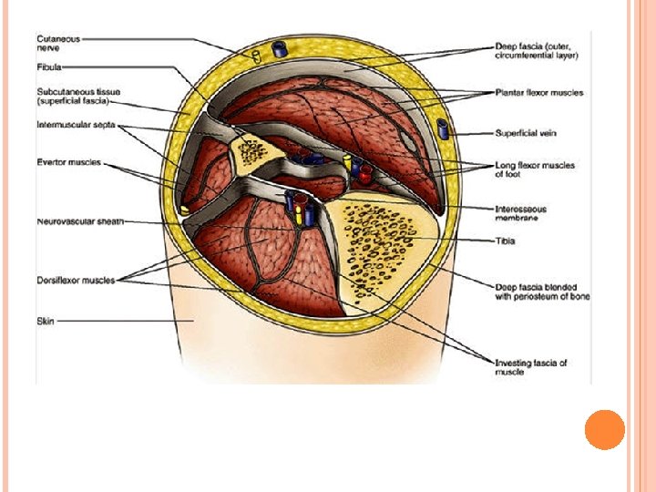 FASCIA Deep Superficial (C. T. ) Epimysium Periosteum (bone) Septa Epineurium (muscles) (nerve) Sheath (blood vessels & nerves) Fatty T. all over the body