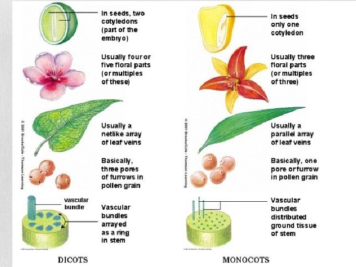 Two subclasses: Monocots and Dicots • Named for the number of seed leaves (cotyledons) in the plant embryo • Angiosperm with 1 cotyledon = monocot • Angiosperm with 2 cotyledons = dicot