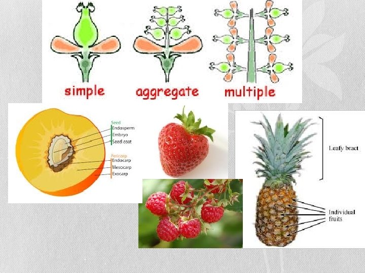 Types of Fruit • Fleshy fruits (peach, cucumber, apples, tomato) • Dry fruit (hazelnut, peanuts, walnuts) • Accessory fruit- not from ovary (strawberry, pineapple)