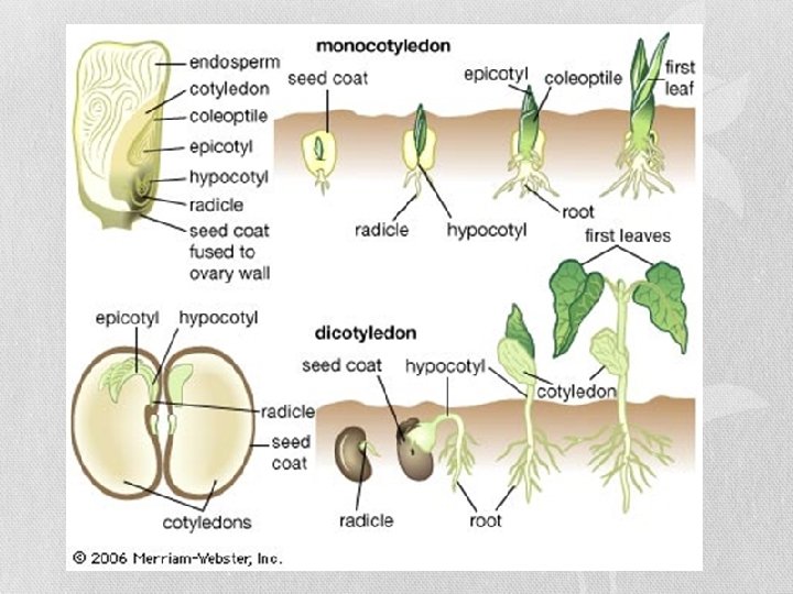 • First part to emerge is the radicle • Becomes root • The hypocotyl is the first part of the plant to push through soil • The hypocotyl straightens out and the epicotyl will emerge • Plants first leaves emerge
